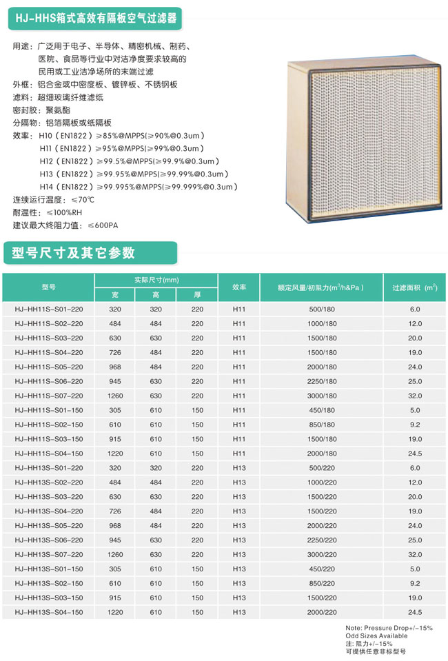 产品名称: HJ-HHS箱式高效有隔板空气过滤器
